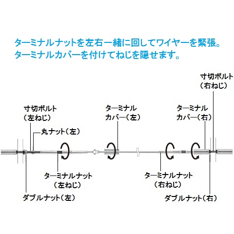 ワイヤーテンショナーの水平端部においてワイヤーをかしめた[ターミナルナット]、および[ターミナルカバー]を接続します。