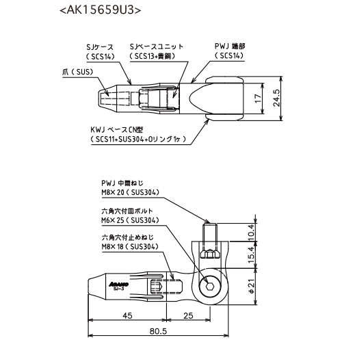 ※材質:SCS14(SUS316相当) SJベース=SCS13+黄銅 爪=特殊ステンレス WWJベースCN型=SUS304+ゴム