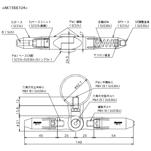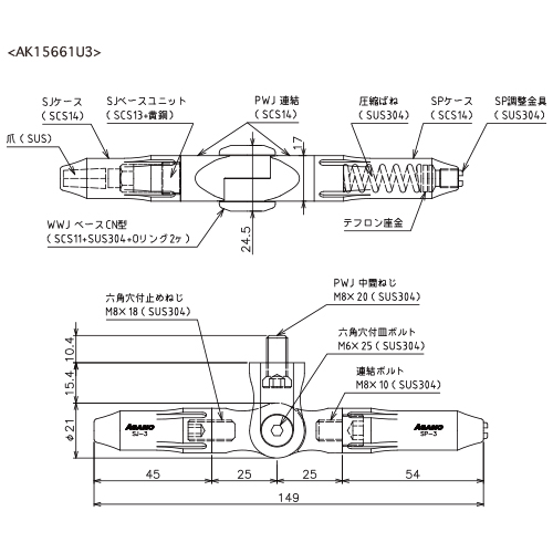※材質:SPターミナル部=SCS14(SUS316相当)、圧縮ばね/ばね調整金具=SUS304 SJターミナル部=SCS14(SUS316相当)、SJベース=SCS13+黄銅 爪=特殊ステンレス KWJベースCN型=特殊ステンレス+SUS304+ゴム