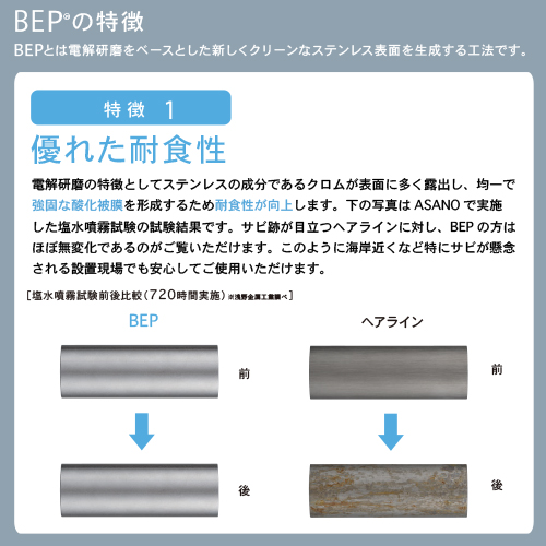 ※受注生産の為、納品まで約3週間いただいております。 こちらの製品は、指紋が目立たない電解研磨[BEP]を施すことができます。詳細は左図にてご確認ください。