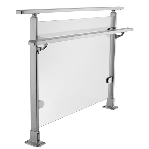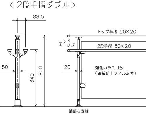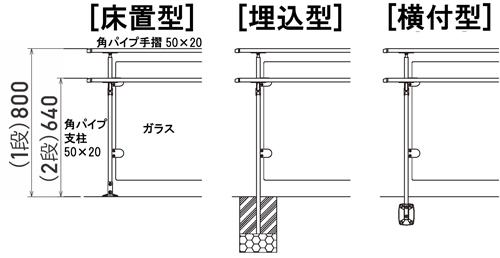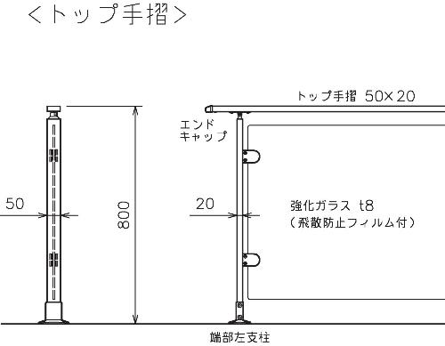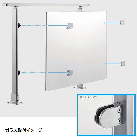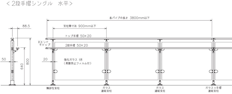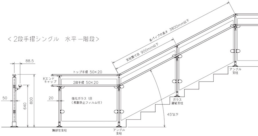 ●端部右/左支柱、ガラス連結支柱、ガラス+手摺連結支柱、アングル支柱、内/外コーナーエルボ支柱があります。