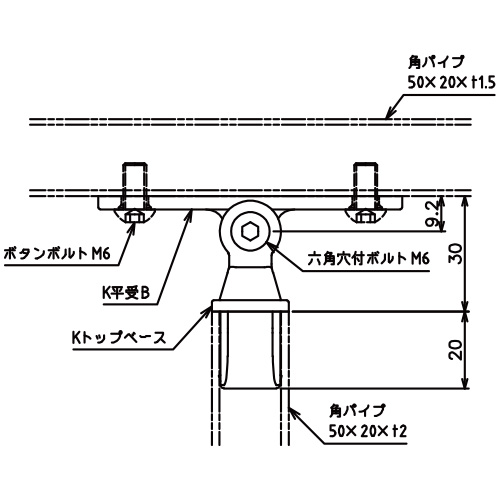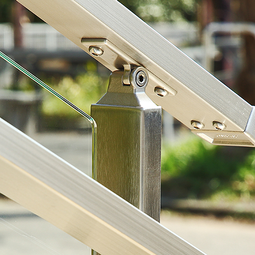 角パイプで構成されているステンレス手摺[AR-K]のトップベースです。 手摺の傾斜角度は45°まで可能。