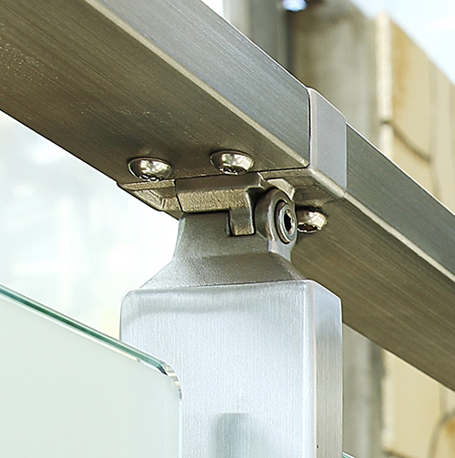 角パイプで構成されているステンレス手摺[AR-K]のトップベースです。 手摺の傾斜角度は45°まで可能。