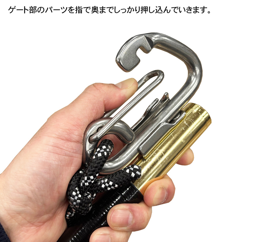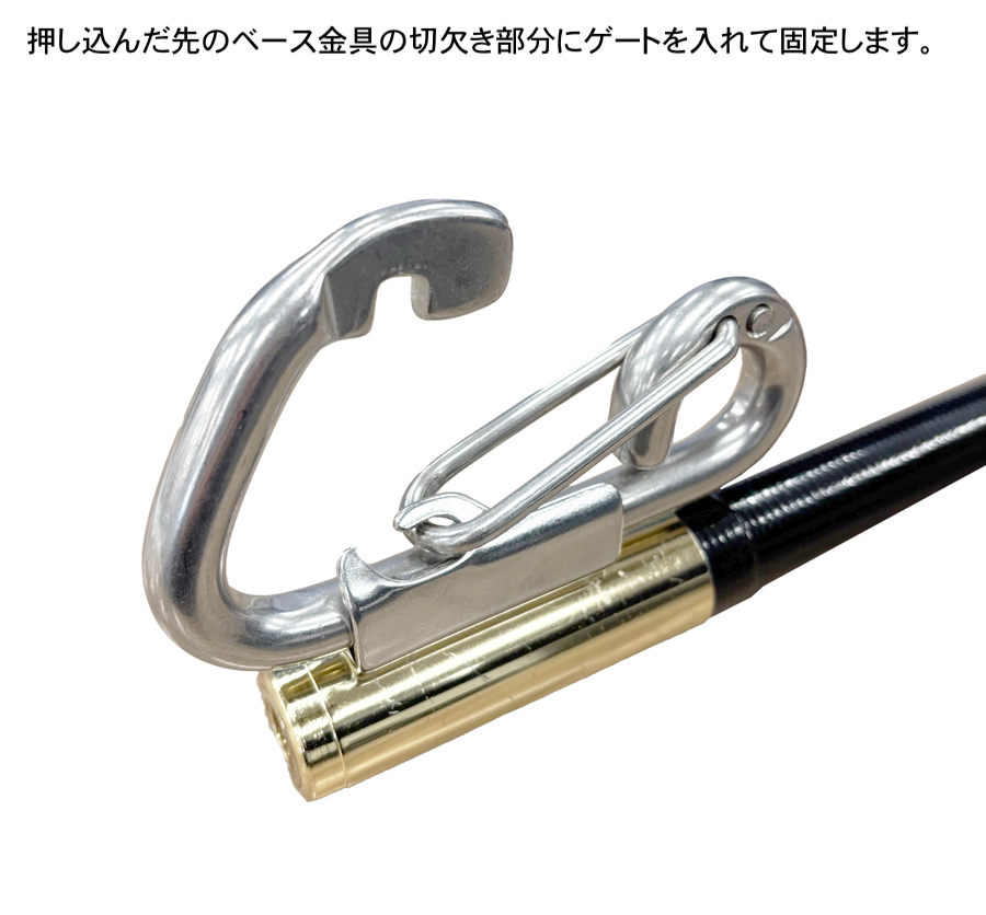 ポールの先端にベースを固定し、開放状態にセットしたフック金具を目的物に引っ掛けて、ポールを引き抜くことで、ゲートが閉じます。